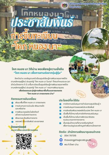 สำนักงานพัฒนาชุมชนอำเภอท่าวังผา โดยนางศรีแพร เหลี่ยมพูล พัฒนาการอำเภอท่าวังผา ขอเชิญชวนครัวเรือนศูนย์เรียนรู้การพัฒนาคุณภาพชีวิตตามหลักทฤษฎีใหม่ ประยุกต์สู่ “โคก หนอง นา โมเดล” ที่ครบกำหนดระยะเวลาเข้าร่วมโครงการ 5 ปี มาขึ้นทะเบียนเป็นศูนย์เรียนรู้การพัฒนาคุณภาพชีวิตตามหลักทฤษฎีใหม่ ประยุกต์สู่ “โคก หนอง นา” กรมการพัฒนาชุมชน เพื่อต่อยอดและมุ่งสู่การพัฒนาพื้นที่แบบอารยเกษตร “โคก หนอง นา อารยเกษตร น่าน” ณ สำนักงานพัฒนาชุมชนอำเภอท่าวังผา จังหวัดน่าน